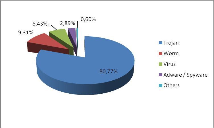 Τα Trojans καταγράφουν ρεκόρ, με ποσοστό 80% μεταξύ όλων των νέων malware, αφού διαφαίνεται ότι αποτελούν την πιο δημοφιλή κατηγορία για τους κυβερνο-απατεώνες προκειμένου να εκμαιεύσουν πληροφορίες από τα υποψήφια θύματά τους. Να σημειώσουμε ότι το 2011, αποτελούσαν το 73% όλων των malware.