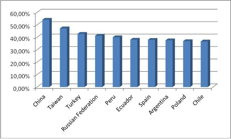 Η Κίνα είναι και πάλι επικεφαλής αυτής της κατάταξης (54,25%), ακολουθούμενη από την Ταϊβάν και την Τουρκία.