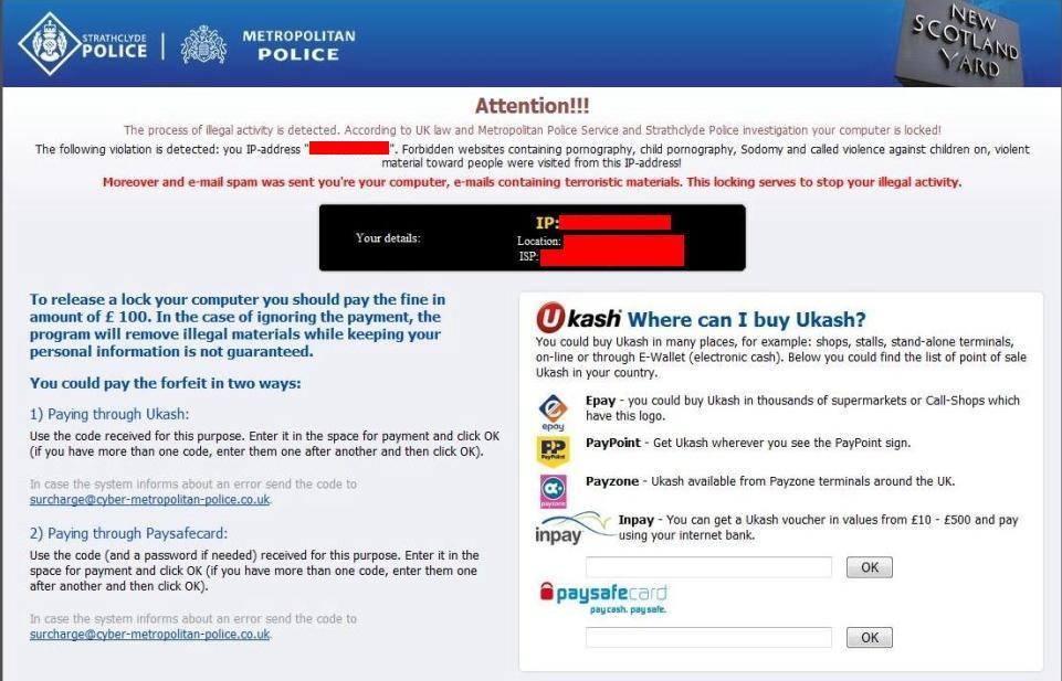 Για να ξεκλειδώσουν οι χρήστες τους υπολογιστές τους, πρέπει να πληρώσουν ένα πρόστιμο, συνήθως της τάξης των € 100, δολάρια ή λίρες (ανάλογα με το στόχο της επίθεσης). Ωστόσο, αυτά τα μηνύματα δεν προέρχονται από την αστυνομία, αλλά από το ίδιο το Trojan.