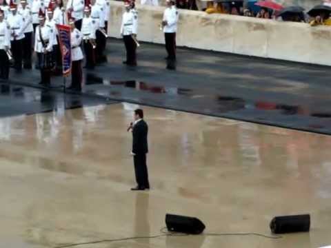 «Με μεγάλη χαρά και έντονη συγκίνηση υποδεχόμαστε την Ολυμπιακή Φλόγα, εδώ, στο Παναθηναϊκό Στάδιο, στην ολοκλήρωση της Λαμπαδηδρομίας επί ελληνικού εδάφους. Eπί οκτώ ημέρες, η Ολυμπιακή Φλόγα στη μοναδική πορεία της, συγκίνησε, ξεσήκωσε, ενέπνευσε και απέδειξε ότι παραμένει το μοναδικό διαχρονικά σύμβολο που προκαλεί στο πέρασμά του δέος, υπερηφάνεια, πίστη στα ιδανικά και τις αξίες του Ολυμπισμού.