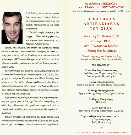 Την Κυριακή 20 Μαΐου 2012 στις 7:00 μ.μ., Θα γίνει η παρουσίαση του τρίτου βιβλίου του Γιάννη Κ. Κωνσταντάτου με τίτλο «Ο Έλληνας Αντιβασιλέας του Σιάμ», στο Αμφιθέατρο Πολιτιστικού – Συνεδριακού Κέντρου «Μίκης Θεοδωράκης».