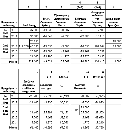 Το συνολικό ποσό που έχουμε λάβει και αναμένεται να λάβουμε από τα δύο προγράμματα χρηματοδότησης του Μηχανισμού Στήριξης, τα οποία έχουν εφαρμοστεί μέχρι τώρα στην Ελλάδα, είναι €229,5 δις (στήλη 1). Πιο συγκεκριμένα, από το 1ο πρόγραμμα διάσωσης για την περίοδο 2010-2011 πήραμε συνολικά €64 δις. Από το πρόγραμμα αυτό υπήρξε ένα ποσό €45 δις (€8 δις το Νοέμβριο του 2011 και €37 δις για το 2012), που δεν εκταμιεύθηκε και ενσωματώθηκε στο νέο πρόγραμμα για το 2012. Από το 2ο πρόγραμμα διάσωσης έχουμε λάβει μέχρι στιγμής €75,65 δις και αναμένεται να λάβουμε μέχρι το 2014 επιπλέον €88,85 δις.