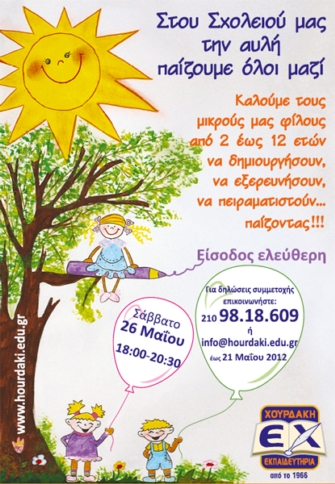 Τα εκπαιδευτήρια Χουρδάκη καλούν τους μικρούς φίλους, από 2 έως 12 ετών, να δημιουργήσουν, να εξερευνήσουν, να πειραματιστούν…παίζοντας, το Σάββατο 26 Μαΐου 18:00 – 20:30. Είσοδος ελεύθερη. Για δηλώσεις συμμετοχής επικοινωνήστε: 210 9818609 ή info@hourdaki.edu.gr έως 23 Μαΐου 2012 Εκπαιδευτήρια Χουρδάκη www.hourdaki.edu.gr