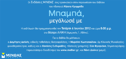 Οι Εκδόσεις Μίνωας σας προσκαλούν στην παρουσίαση του βιβλίου του ηθοποιού Κώστα Κρομμύδα «Μπαμπά, μεγάλωσέ με», την Τετάρτη 6 Ιουνίου 2012 και ώρα 8:00 μ.μ., στο θέατρο Αλίκη.