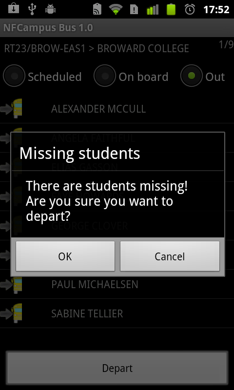 Η υπηρεσία έχει ενημερώνει τον συνοδό, μέσω του app NFC Campus στο κινητό του, ποιοι μαθητές πρέπει να επιβιβαστούν στο λεωφορείο που δήλωσε ότι περιμένει. Στην ίδια λίστα βλέπει που έχει προγραμματιστεί να αποβιβαστεί κάθε επιβάτης στο προγραμματισμένο δρομολόγιο.
