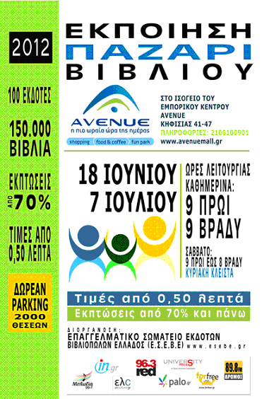Η Εκποίηση – Παζάρι Βιβλίου 2012 οργανώνεται από το Επαγγελματικό Σωματείο Εκδοτών – Βιβλιοπωλών Ελλάδος (Ε.Σ.Ε.Β.Ε.) στο Εμπορικό Κέντρο Avenue, από 18 Ιουνίου έως 7 Ιουλίου. Ώρες λειτουργίας: Καθημερινά: 9 το πρωί έως 9 το βράδυ. Σάββατα: 9 το πρωί έως 8 το βράδυ. Κυριακή: κλειστά. Οι Έλληνες εκδότες, αποφάσισαν την διοργάνωση της εκδήλωσης και […]