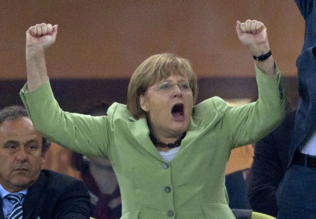 Η Άνγκελα Μέρκελ μετά το τέλος της αναμέτρησης της Γερμανίας με την Ελλάδα επισκέφτηκε τα αποδυτήρια για να συγχαρεί τους παίκτες της ομάδας και τον Γιόακιμ Λεβ.
