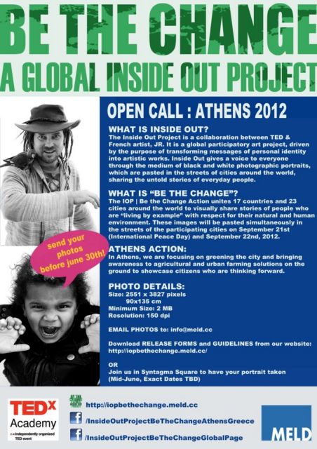 Την Παγκόσμια Ημέρα Ειρήνης, αυτό τον Σεπτέμβριο, θα δούμε γιγαντιαία πόστερ με πορτρέτα Αθηναίων που υποστηρίζουν ότι η Αθήνα μπορεί να αποτελέσει καλλιεργήσιμη γη, ακόμα κι αν οι κήποι μας βρίσκονται στις ταράτσες πολυόροφων πολυκατοικιών. Με την τέχνη, η πόλη μπορεί να γίνει πράσινη, λένε τα μέλη του διεθνούς πρότζεκτ «Inside Out», που φέρει την υπογραφή ενός καλλιτέχνη που πήρε το βραβείο TED το 2011.