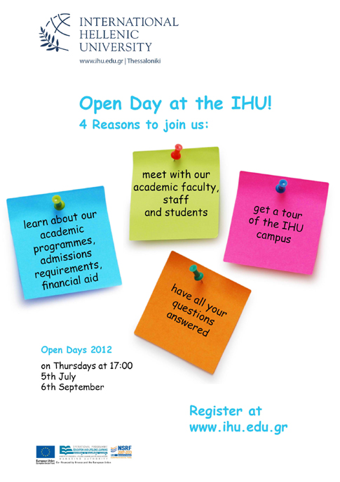Δηλώσεις συμμετοχής στο www.ihu.edu.gr ή στα τηλέφωνα 2310807502, -520, -528 ή με email στο marketing@ihu.edu.gr