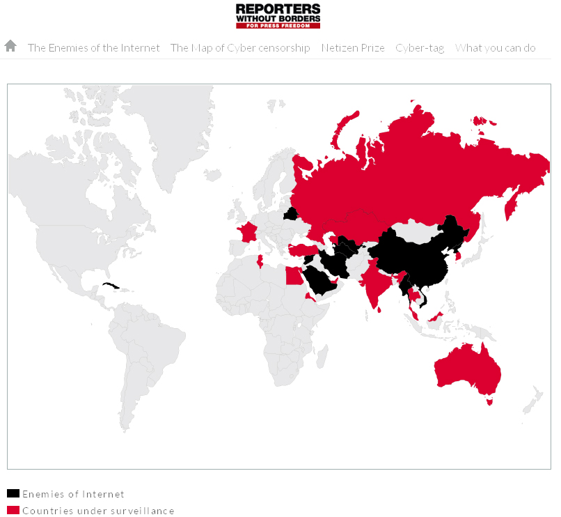 Ο Χάρτης των χωρών που θεωρούνται εχθρικές προς το Διαδίκτυο, σύμφωνα με τους Δημοσιογράφους χωρίς Σύνορα (rsf.org). Με μαύρο χρώμα εμφανίζονται οι «εχθροί» και με κόκκινο, χώρες που βρίσκονται υπό επιτήρηση, λόγω κάποιων κρουσμάτων που θα μπορούσαν να τις εντάξουν στην λίστα.