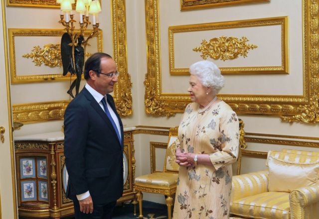 Ένα φλιτζάνι τσάι προσκλήθηκε ο Γάλλος πρόεδρος, Φρανσουά Ολάντ, να πιει στον Πύργο του Ουίνδσορ κοντά στο Λονδίνο, με τη βασίλισσα Ελισάβετ Β΄, σε μια τετ-α-τετ συνάντηση, χωρίς διερμηνέα, καθώς ο Γάλλος πρόεδρος μιλά αγγλικά και η Βασίλισσα γαλλικά.