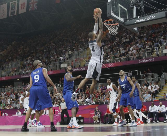 Ένα δεκάλεπτο χρειάστηκαν οι ΗΠΑ για να επιβάλουν την κυριαρχία τους με αντίπαλο τη Γαλλία των έξι ΝΒΑερ. Το τελικό, 98-71, υπέρ της κατόχου του χρυσού μεταλλίου στο Πεκίνο αντικατοπτρίζει τη διαφορά δυναμικότητας, η οποία αριθμητικά απεικονίζεται σε 27 ασίστ και… 56 ριμπάουντ! Κορυφαίος των Αμερικανών ο Ντουράντ με 22 πόντους, 9 ριμπάουντ, ενώ για τη Γαλλία οι Τραορέ και Πάρκερ είχαν από 12 και 10 πόντους αντίστοιχα. Την ερχόμενη Τρίτη (31/7) οι Αμερικανοί αντιμετωπίζουν την Τυνησία, ενώ οι Γάλλοι έχουν έναν ακόμη δύσκολο αγώνα απέναντι στην κάτοχο του χάλκινου μεταλλίου στο Πεκίνο, Αργεντινή.