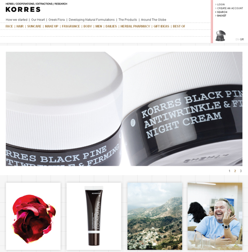 www.korres.com έχει λειτουργικό design, minimal αισθητική, πλούτο πληροφοριών. Θα βρείτε όλα τα προϊόντα της εταιρείας, τις τιμές τους, τα best seller και –το καλύτερο- e-shop! Αν υπήρχαν βραβεία για σχεδιασμό site, σίγουρα θα του έδινα το πρώτο.