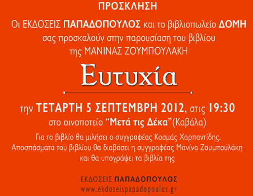 Οι εκδόσεις Παπαδόπουλος και το βιβλιοπωλείο Δομή σας προσκαλούν στην παρουσίαση του βιβλίου της Μανίνας Ζουμπουλάκη «Ευτυχία», την Τετάρτη 5 Σεπτεμβρίου, στις 19.30.