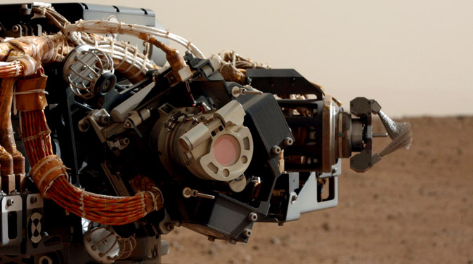Το αριστερό μάτι της κύριας κάμερας του ρομπότ. Δεξιά διακρίνεται μια βούρτσα για το ξεσκόνισμα των υπό εξέταση βράχων (Πηγή: NASA/JPL-Caltech/MSSS)