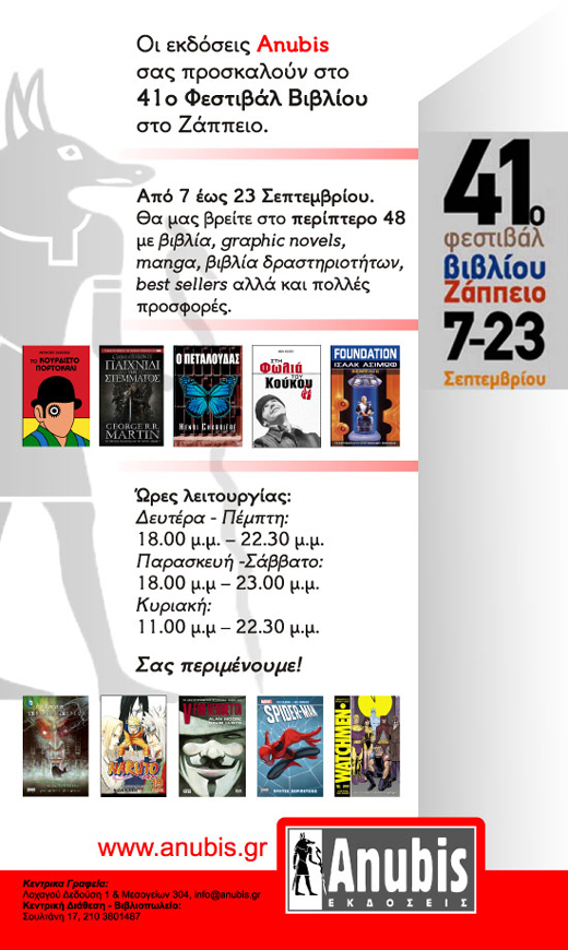 Οι Εκδόσεις Anubis σας προσκαλούν στο 41ο Φεστιβάλ Βιβλίου, στο περίπτερο 48, στο Ζάππειο, 7 έως 23 Σεπτεμβρίου. Κάντε Like στη σελίδα της Ψυχαγωγίας στο Facebook