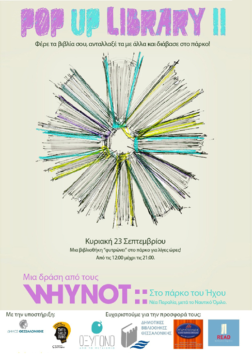 Η oμάδα των WHYNOT μετά από ένα χρόνο με πολλές δράσεις, ευτυχισμένες στιγμές και πολλή δουλειά, επιστρέφει για να γιορτάσει τα γενέθλιά της, με τον τρόπο που ξεκίνησε: με την pop-up βιβλιοθήκη της. Και πάλι σε έναν από τους αγαπημένους της δημόσιους χώρους! Στον ένα χρόνο που πέρασε από την οργάνωση της πρώτης pop-up βιβλιοθήκης στην Ελλάδα η ομάδα WHYNOT πραγματοποίησε μικρές και μεγάλες εκδηλώσεις, διοργάνωσε το εναλλακτικό φεστιβάλ ‘Θέατρο στο Πάρκο’, κέρδισε το βραβείο YOUNG GREECE στα Mad Awards 2012, βγήκε στους δημόσιους χώρους και πάνω από όλα γνώρισε πολλούς Θεσσαλονικείς που θέλουν μία καλύτερη και πιο φιλική πόλη για να ζουν. Η ομάδα οργανώνει για δεύτερη χρονιά την Βιβλιοθήκη στο Πάρκο! Μαζέψτε όσα βιβλία (ή περιοδικά) δεν θέλετε, βάλτε τα σε μία τσάντα, πάρτε την παρέα σας ή τα παιδιά σας και ελάτε να τα ανταλλάξετε, ακριβώς όπως πέρυσι! Δηλαδή αφήνοντας τα δικά σας βιβλία και παίρνοντας άλλα, χωρίς να χρειαστεί να δώσετε καθόλου χρήματα.