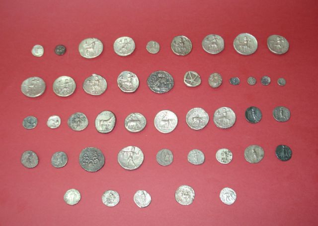 Ειδικότερα, πρόκειται για ένα ασημένιο νόμισμα Μεγάλου Αλεξάνδρου ελληνιστικής εποχής, ένα ασημένιο νόμισμα Αντωνίνου ρωμαϊκής εποχής, δύο αρχαία ασημένια νομίσματα, ένα ρωμαϊκό χρυσό νόμισμα αυτοκρατορικών χρόνων, ένα χρυσό νόμισμα Αλεξάνδρου ελληνιστικής εποχής, ένα αρχαίο χρυσό φθαρμένο νόμισμα σε β΄ χρήση, 73 χρυσά οθωμανικά νομίσματα, ένα χρυσό βυζαντινό νόμισμα που μετατράπηκε σε μενταγιόν σε μεταγενέστερη περίοδο, τέσσερα χρυσά οθωμανικά νομίσματα που μετασκευάστηκαν σε δύο ζεύγη σκουλαρικιών, ένα τετράπλευρο χρυσό αντικείμενο- νόμισμα, ένα χρυσό ευρωπαϊκό νόμισμα του 1758 μΧ, ένα χρυσό ευρωπαϊκό νόμισμα του 1800 μΧ, δύο χρυσά νομίσματα, μία ασημένια αγκράφα ζώνης νεότερων χρόνων και ένα φέσι με χρυσά οθωμανικά νομίσματα νεότερων χρόνων.