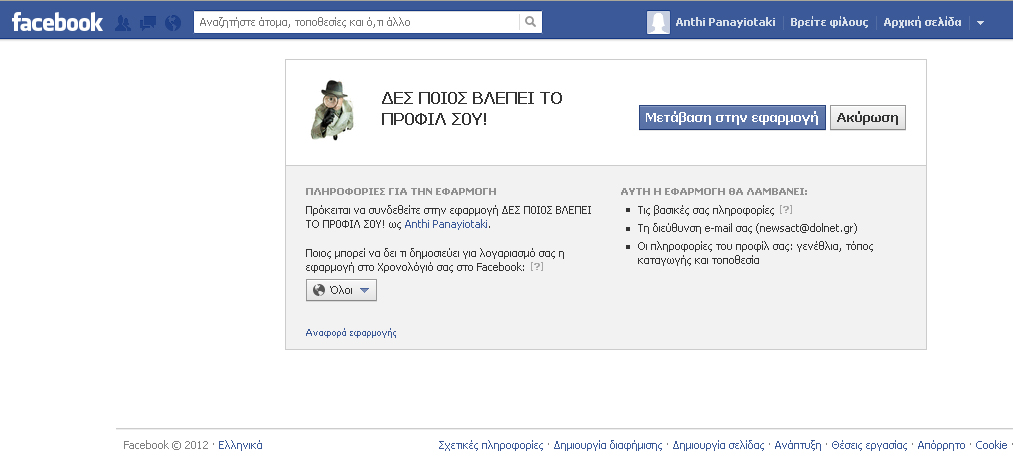 Κάπως έτσι, οι φίλοι σας γρήγορα θα μάθουν ότι «εσείς ξέρετε ποιοι κοιτάνε τη σελίδα σας» και ό,τι θα μπορούσαν να κάνουν το ίδιο. Μόνο που, σκοπός της ύπαρξης τέτοιων εφαρμογών (δεν είναι μόνο μια στην κατηγορία Facebook Profile Viewer) είναι να εκμεταλλευτεί την περιέργειά μας και να αποφέρει χρήματα σε κάποιους που πληρώνονται για να σας οδηγήσουν σε άσκοπες δημοσκοπήσεις ή για την διασπορά ιών ή spam δημοσιεύοντας στην δική σας σελίδα παραπομπές σε μολυσμένους δικτυακούς τόπους.