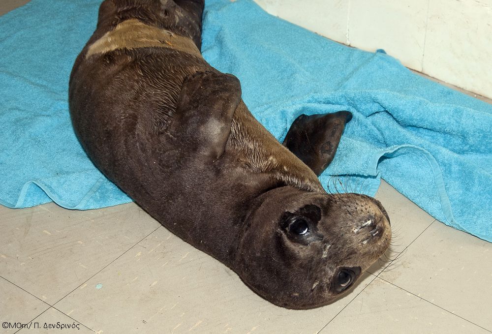 Στη συνέχεια η μικρή φώκια μεταφέρθηκε στο Κέντρο Περίθαλψης και Επανένταξης Μεσογειακής Φώκιας της MOm στην Αλόννησο. Από την πρώτη εξέταση του ζώου διαπιστώθηκε ότι επρόκειτο για ένα αρσενικό ζώο, ηλικίας περίπου 3 εβδομάδων, και βάρους 20 κιλών, πολύ αφυδατωμένο και εξαντλημένο. Αφού πραγματοποιήθηκαν όλες οι απαραίτητες κτηνιατρικές εξετάσεις και με τις οδηγίες της υπεύθυνης κτηνιάτρου Δρ. Νατάσσας Κομνηνού, του παρασχέθηκαν οι πρώτες βοήθειες και ξεκίνησε η φαρμακευτική αγωγή.