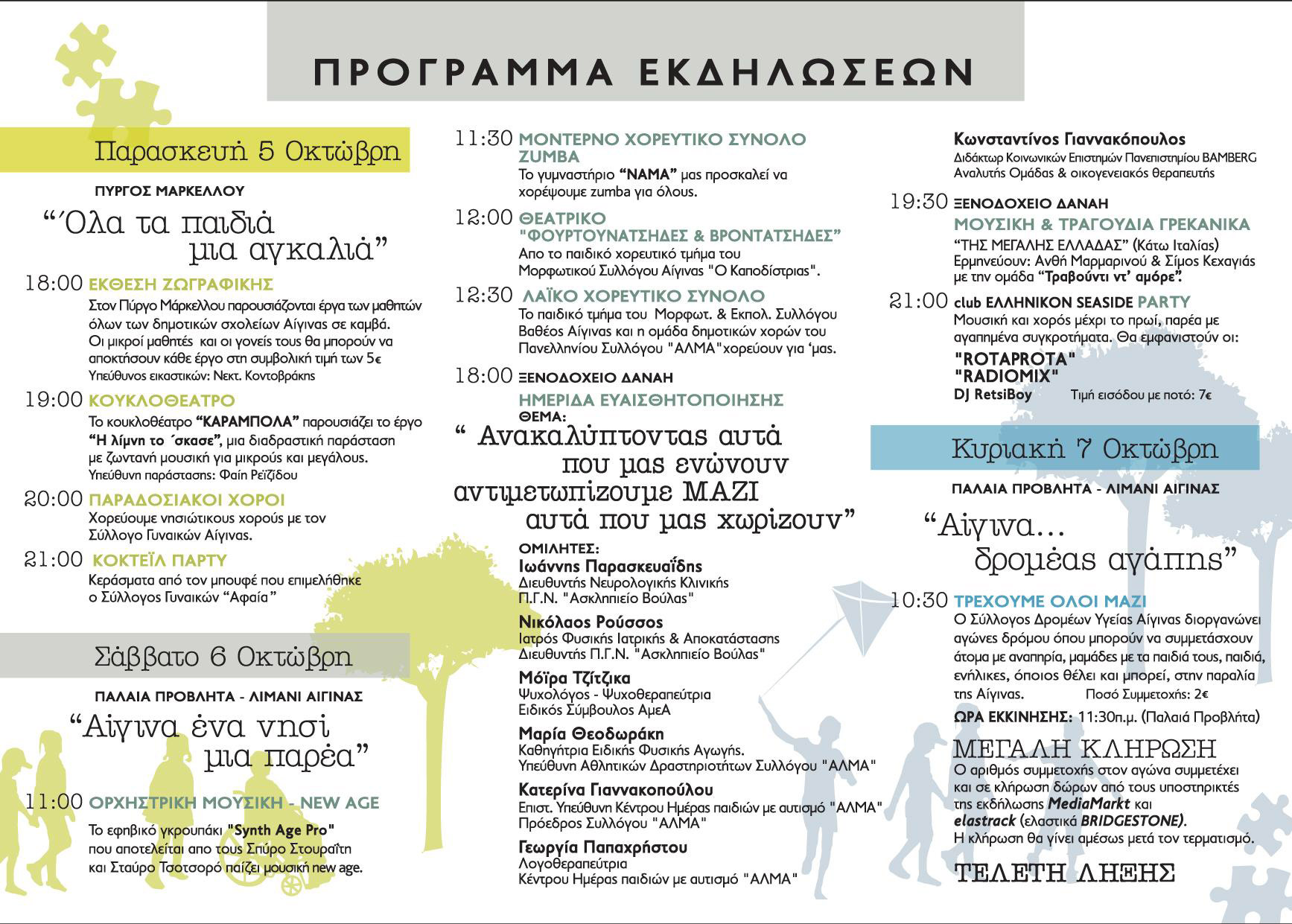 Η εν λόγω πρωτοβουλία περιλαμβάνει ένα τριήμερο εστιασμένο τόσο στην ψυχαγωγία όσο και στην ενημέρωση, γεμάτο παιχνίδι, τραγούδι, χορό, αθλοπαιδιές, έκθεση ζωγραφικής με έργα των μαθητών δημοτικού της Αίγινας, αγώνες δρόμου και μια ημερίδα με πολύ ενδιαφέρουσες τοποθετήσεις.