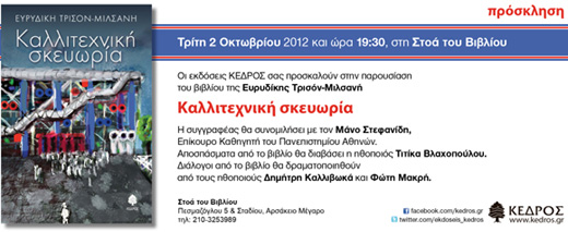 Οι εκδόσεις Κέδρος σάς προσκαλούν στην παρουσίαση του βιβλίου της Ευρυδίκης Τρισόν – Μιλσανή, «Καλλιτεχνική σκευωρία», την Τρίτη 2 Οκτωβρίου και ώρα 19:30 | αίθουσα Λόγου της Φιλεκπαιδευτικής Εταιρίας στη Στοά του Βιβλίου.