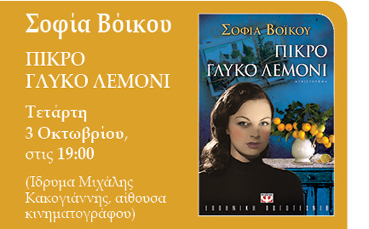 Το Ίδρυμα Μιχάλης Κακογιάννης και οι Εκδόσεις Ψυχογιός σας προσκαλούν σε μια συνάντηση με τη συγγραφέα Σοφία Βόικου, με αφορμή την έκδοση του καινούργιου της βιβλίου με τίτλο “Πικρό γλυκό λεμόνι”, την Τετάρτη 03 Οκτωβρίου, στις 19:00 μμ.