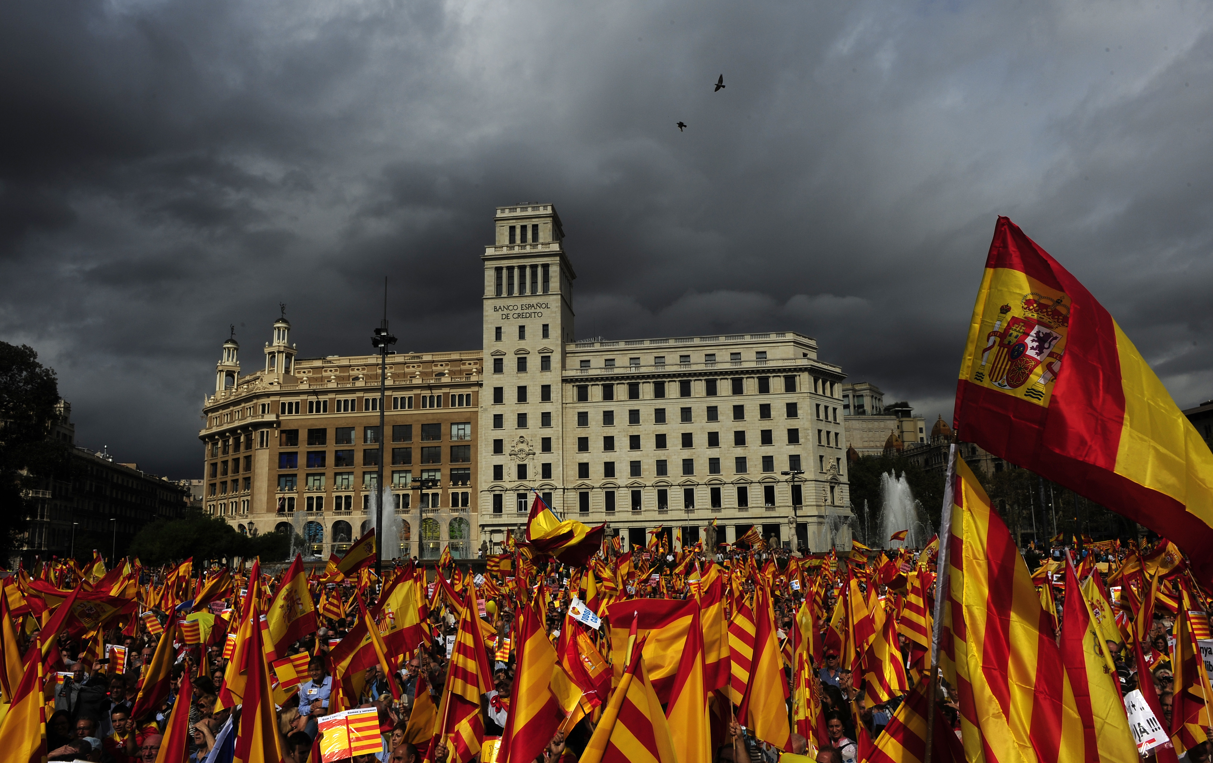Περίπου 6.000 άνθρωποι γέμισαν, παρά τη βροχή, το μεσημέρι της Παρασκευής την εμβληματική Plaza de Cataluña της Βαρκελώνης, προκειμένου να διαδηλώσουν υπέρ της διατήρησης της εδαφικής ακεραιότητας της Ισπανίας. Κρατώντας ισπανικές και καταλανικές σημαίες, φώναξαν «όλοι είμαστε Καταλονία».