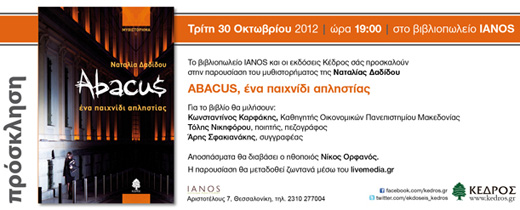 Η Ναταλία Δαδίδου παρουσιάζει το βιβλίο της “Abacus ένα παιχνίδι απληστίας”, εκδόσεις Κέδρος, την Τρίτη 30 Οκτωβρίου, στις 19.00, στον Ιανό (Αριστοτέλους 7, Θεσσαλονίκη).