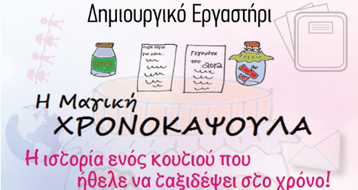 Η Μαγική Χρονοκάψουλα, η ιστορία ενός κουτιού που ήθελε να ταξιδέψει στο χρόνο. Το Δημιουργικό Εργαστήρι για τη νέα σχολική χρονιά θα έχει ως κεντρικό θέμα του τη δημιουργία μιας Χρονοκάψουλας και απευθύνεται σε παιδιά ηλικίας από 4 έως 12 ετών. http://entertainment.in.gr/html/ent/576/ent.131576.asp