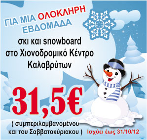 Για λίγες μόνο μέρες ακόμα - μέχρι τις 31 Οκτωβρίου 2012 - μπορείτε να εξασφαλίσετε 1 ολόκληρη εβδομάδα σκι στο Χιονοδρομικό κέντρο Καλαβρύτων, μόνο με 31.5 ευρώ!