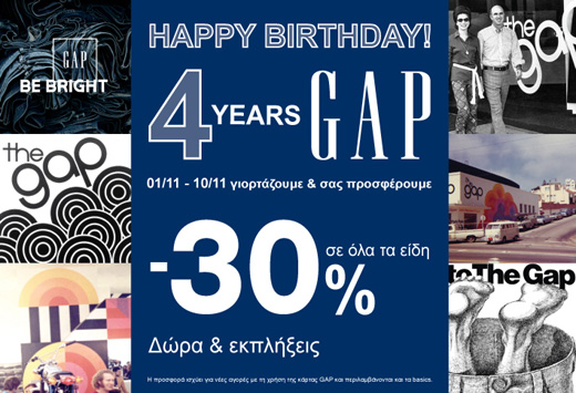 Αποκλειστικά και μόνο για το διάστημα των εορτασμών, από Πέμπτη 1 έως Σάββατο 10 Νοεμβρίου, τα Gap θα γιορτάσουν τα γενέθλιά τους προσφέροντας, με την επίδειξη της Κάρτας Gap, γενέθλια …έκπτωση 30% για κάθε αγορά ρούχων και αξεσουάρ από τη Φθινοπωρινή αλλά και Basic γυναικεία, ανδρική, παιδική και βρεφική συλλογή, δίνοντάς μας την ευκαιρία να ανανεώσουμε τη διάθεση αλλά και την γκαρνταρόμπα μας, με νέα Gap fashion statement από την:
