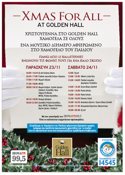 Για περισσότερες πληροφορίες για τη συγκέντρωση των προϊόντων για τα Κέντρα Στήριξης Παιδιών με προβλήματα Διαβίωσης του Χαμόγελου του Παιδιού, τις ώρες των συναυλιών , καθώς και το πρόγραμμα εκδηλώσεων του Golden Hall, παρακαλώ επισκεφτείτε την ιστοσελίδα www.mygoldenhall.gr