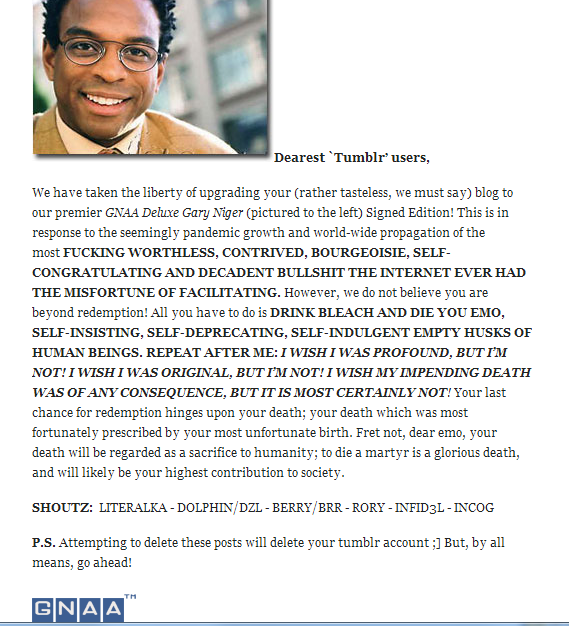 Ανυποψίαστοι μπλόγκερ είδαν στο dashboard του μπλογκ τους μια ανάρτηση που δεν είχαν την πρόθεση να ανεβάσουν οι ίδιοι. Ήταν ένα μήνυμα με το οποίο οι GNAA εξέφραζαν το μίσος τους για την πρακτική τήρησης μπλογκ, ως μια ενέργεια εγωκεντρική, που κατέληγε με την ευχή να εξαφανιστούν από προσώπου… WWW. Με ένα κλικ, το spam post ανέβαινε στο blog τους. Οι GNAA απειλούσαν τους μπλόγκερ πως εάν επιχειρούσαν να διαγράψουν το post, ολόκληρο το blog τους θα διαγραφόταν και, φυσικά, τους προέτρεπαν να το κάνουν. Η ανάρτηση που μόλυνε χιλιάδες μπλογκ στο Tumblr στις 3 Δεκεμβρίου 2012