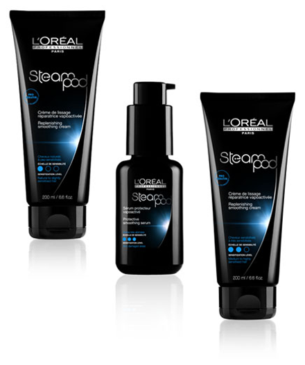 To νέο σάς το άφησα για το τέλος. Μια νέα μέθοδος λείανσης των μαλλιών, η Steampod, που ταυτόχρονα περιποιείται την τρίχα και περιλαμβάνει δυο στάδια: Στο πρώτο εφαρμόζεται η κρέμα ή το σέρουμ Steampod ένα προϊόν της L’Oreal Professionnel, με προκερατίνη, ceramides και ιοντικούς παράγοντες που βοηθούν στην αναδόμηση της τρίχας και την ενδυνάμωση του εσωτερικού της.