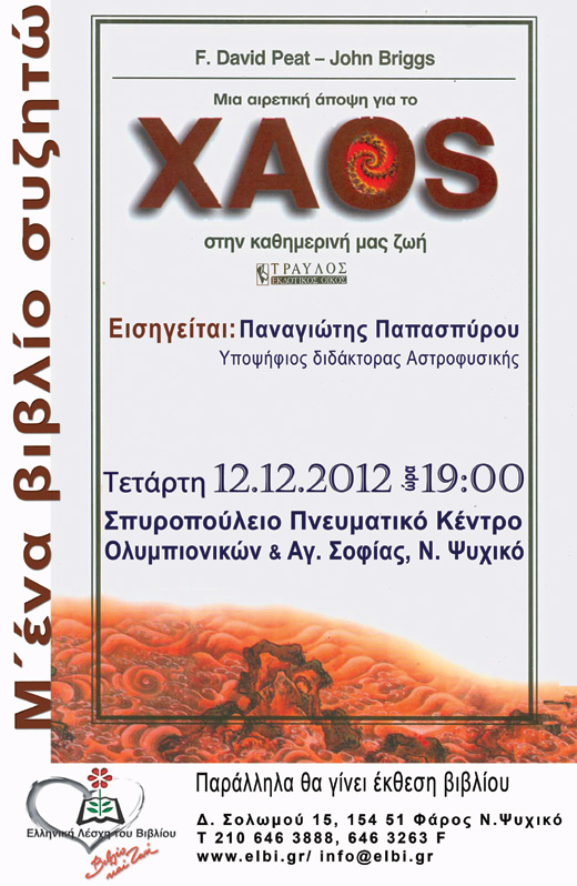 Ο Παναγιώτης Παπασπύρου, υποψήφιος Διδάκτορας Αστροφυσικής θα εισηγηθεί για συζήτηση τη μελέτη των Ντέϊβιντ Πητ και Τζων Μπριγκς, για το «ΧΑΟΣ –Μια αιρετική άποψη για το χάος στην καθημερινή μας ζωή», Εκδ. «Τραυλός».