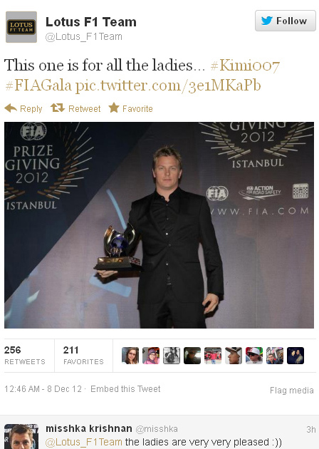 Ο «Iceman» πόζαρε στο φωτογραφικό φακό με το βραβείο του με περίσσια άνεση και η ομάδα του στη Lotus αποφάσισε να τον «πειράξει» ποστάροντας την φωτογραφία του στο Twitter με σχόλιο «Αυτό είναι για όλες τις κυρίες»!