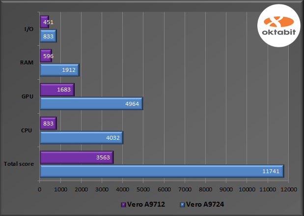 Στο forum, η Oktabit εκθέτει τα αποτελέσματα του μετροπρογράμματος AnTuTu 3.0.2, με το οποίο συγκρίνει τις επιδόσεις του VERO tablet A9712 με τον διάδοχό του Α9724: «Το αποτέλεσμα είναι αυξημένες επιδόσεις παντού και ιδιαίτερα στην κάρτα γραφικών και στον επεξεργαστή όπου σύμφωνα με το AnTuTu benchmark (version 3.0.2) η απόδοση εμφανίζεται 3 με 4 φορές μεγαλύτερη.»