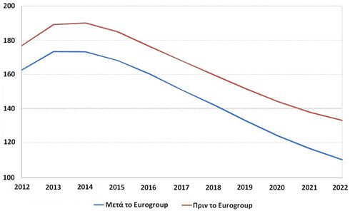 Διάγραμμα 1. Εκτιμήσεις για το λόγο χρέους προς ΑΕΠ πριν και μετά τη συμφωνία του Eurogroup