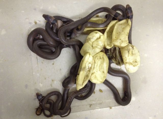 Ο μικρός μάζευε αυγά που έβρισκε στον κήπο του σπιτιού του, χωρίς να ξέρει περί τίνος πρόκειται, τα είχε τοποθετήσει σε ένα δοχείο και τα έκρυβε στην ντουλάπα του. Μετά από μία εβδομάδα, τα αυγά έσπασαν και βγήκαν δηλητηριώδη φίδια.