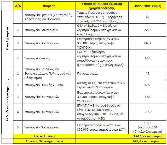 Ήδη πληρώθηκαν 693,4 εκατ. ευρώ για εφάπαξ, δήμους, φαρμακοποιούς, πανεπιστήμια και επιστροφές φόρων, ενώ συνολικά θα καταβληθούν 1,61 δισ. ευρώ.
