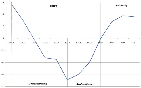 Διάγραμμα 1. Οι φάσεις της μεγέθυνσης στην Ελληνική οικονομία (% μεταβολή ΑΕΠ))