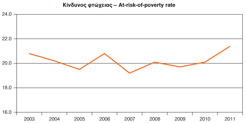 Στο άλλο συστατικό του εκρηκτικού μείγματος, τη φτώχεια, η έρευνα δείχνει αύξηση από το 19,7% το 2009, σε 20,1% το 2010 και 21,4% το 2011. Τα ποσοστά αυτά είναι μετά τις κοινωνικές μεταβιβάσεις, δηλαδή ΕΚΑΣ, εισοδηματικές ενισχύσεις, επιδόματα ανέργων, οικογενειακά και άλλα επιδόματα ή βοηθήματα.