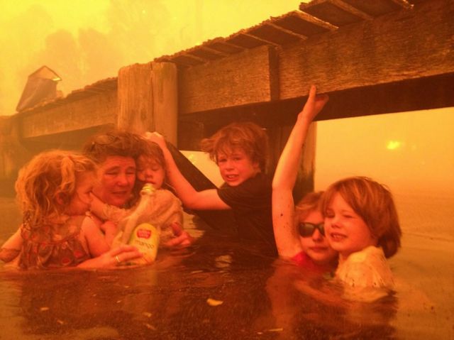 Την ίδια στιγμή, τον γύρο του Διαδικτύου κάνουν οι φωτογραφίες μίας οικογένειας από το παραθαλάσσιο Ντάναλι της Τασμανίας: Η Τάμι Χολμς με τα πέντε εγγόνια της βρήκαν καταφύγιο βουτώντας στη θάλασσα, κάτω από ξύλινη προκυμαία, ενώ οι φλόγες έκαιγαν το σπίτι τους. Tις φωτογραφίες τράβηξε ο παππούς της οικογένειας, που βρισκόταν σε μικρή βάρκα.