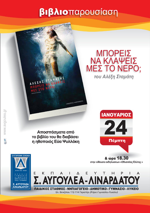 Την Πέμπτη 24 Ιανουαρίου 2013, και ώρα 18.30, η Βιβλιοθήκη των εκπαιδευτηρίων Σ. Αυγουλέα – Λιναρδάτου και οι εκδόσεις Καστανιώτη παρουσιάζουν στην αίθουσα εκδηλώσεων του σχολείου «Οδυσσέας Ελύτης» το νέο βιβλίο του Αλέξη Σταμάτη «Μπορείς να κλάψεις μες στο νερό;».