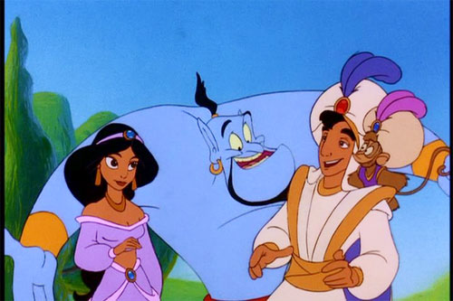 Το τρίτο κατά σειρά καρτούν της νέας εποχής της Ντίσνεϊ είναι ένα ακόμα παραμύθι σε σκίτσο: εξωτική ατμόσφαιρα, παζάρια της Ανατολής, χαμίνια που ερωτεύονται πριγκίπισσες, περιπέτειες στην έρημο, κρυμμένοι θησαυροί, μαγικά λυχνάρια, πτήσεις με το μαγικό χαλί, δευτερεύοντες κωμικοί χαρακτήρες και ο απαραίτητος «κακός» της ιστορίας που τελικά βρίσκει την τιμωρία που του αξίζει. Υπάρχουν ωστόσο στοιχεία που ρίχνουν άφθονο… αλατοπίπερο στη ζαχαρένια διάθεση του συγκεκριμένου καρτούν. Ο Ρόμπιν Γουίλιαμς δημιουργεί ίσως τον πιο απολαυστικό χαρακτήρα στην ιστορία της Ντίσνεϊ: ένας ζωντανός χείμαρρος που επιδίδεται σε one man show είτε παίζοντας με τις λέξεις είτε σατιρίζοντας και διακωμωδώντας οικείους χαρακτήρες και καταστάσεις. Η ταινία κέρδισε δύο Όσκαρ (Τραγουδιού και Μουσικής), ισάριθμες Χρυσές Σφαίρες στις ίδιες κατηγορίες, δυο Γκράμι.