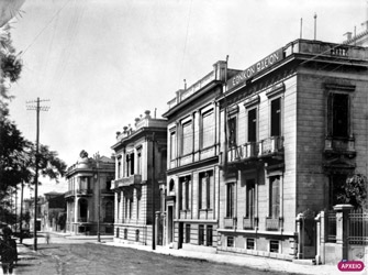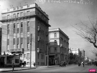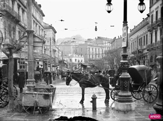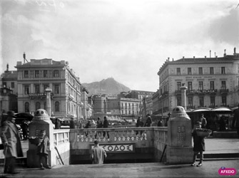 Βροχερή μέρα στην Αθήνα του 1927. Η οδός Πανεπιστημίου από την πλατεία Ομονοίας, μόνιππα αμάξια, αυτοκίνητα και πεζοί με ομπρέλες. | | Η είσοδος του σταθμού ηλεκτρικού σιδηροδρόμου στην Ομόνοια στη δεκαετία του ‘30. Στο βάθος, η οδός Πανεπιστημίου και τα ξενοδοχεία «Excelsior» και «Plaza» στις δύο πλευρές του δρόμου. |