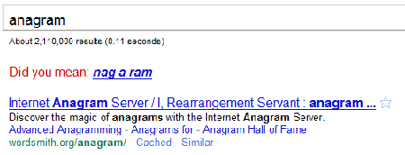Αν εισάγετε τη λέξη anagram («αναγραμματισμός»), το Google θα σας ρωτήσει αν εννοείτε «nag a ram».