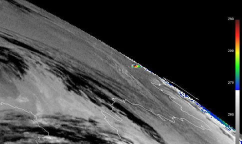 Στη δορυφορική εικόνα, η έκρηξη αντιστοιχεί στη χρωματιστή κηλίδα (Πηγή: Eumetsat)