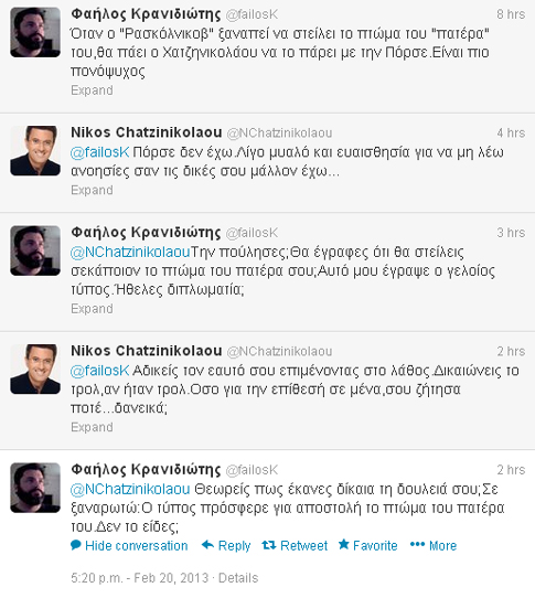 Ο διάλογος στη συνέχεια εξελίχθηκε ως εξής: Κρανιδιώτης: @NChatzinikolaou Την πούλησες; Θα έγραφες ότι θα στείλεις σε κάποιον το πτώμα του πατέρα σου; Αυτό μου έγραψε ο γελοίος τύπος. Ήθελες διπλωματία; Χατζηνικολάου: @failosK Αδικείς τον εαυτό σου επιμένοντας στο λάθος. Δικαιώνεις το τρολ, αν ήταν τρολ. Οσο για την επίθεσή σε μένα, σου ζήτησα ποτέ… δανεικά; Κρανιδιώτης: @NChatzinikolaou Θεωρείς πως έκανες δίκαια τη δουλειά σου; Σε ξαναρωτώ: Ο τύπος πρόσφερε για αποστολή το πτώμα του πατέρα του. Δεν το είδες;